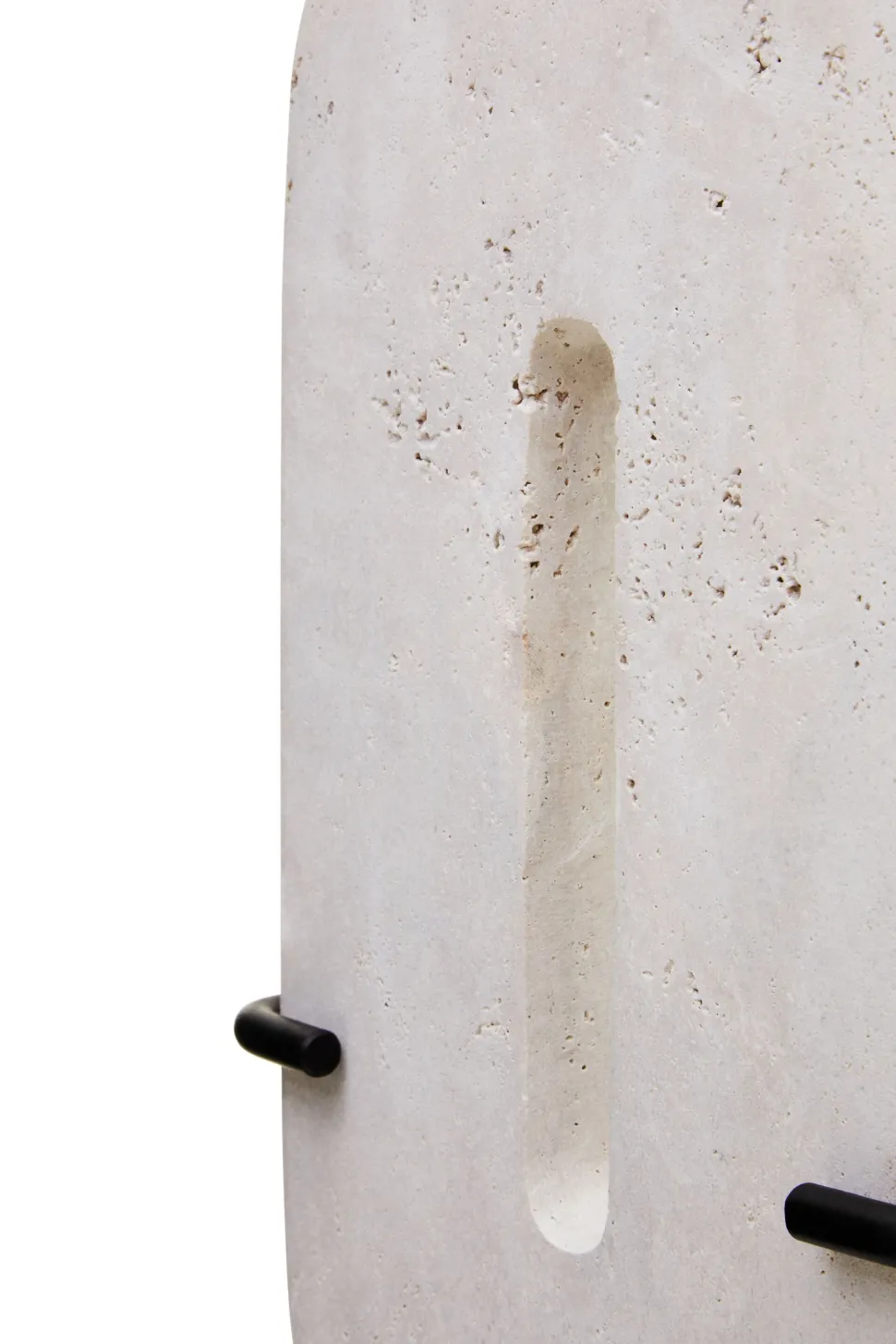 - Material: Natural Travertine Stone Sculpture / Acacia Wood Base / Iron Stem