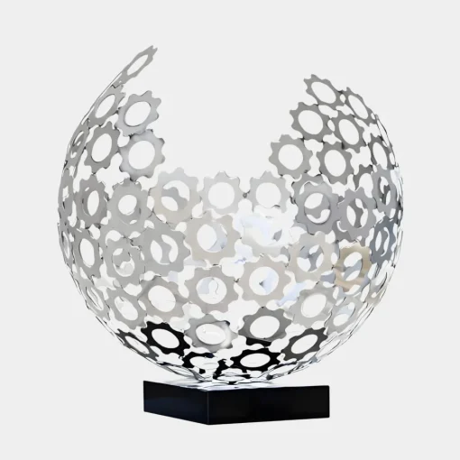 This stainless steel sculpture is designed for both indoor and outdoor spaces offering versatility and lasting appeal. Its weather-resistant construction ensures durability making it an ideal addition to gardens, patios, courtyards or landscaped areas where it interacts beautifully with natural elements. Indoors, it serves as an eye-catching centrepiece in living rooms, office lobbies and entryways effortlessly complementing contemporary, minimalist or industrial décor. The sculpture’s dynamic form and reflective surfaces make it a statement piece that sparks conversation and admiration. Whether placed in an intimate setting or as a bold architectural accent, the Lunar Sphere Sculpture brings sophistication and artistic expression to any environment creating an engaging and thought-provoking visual experience.