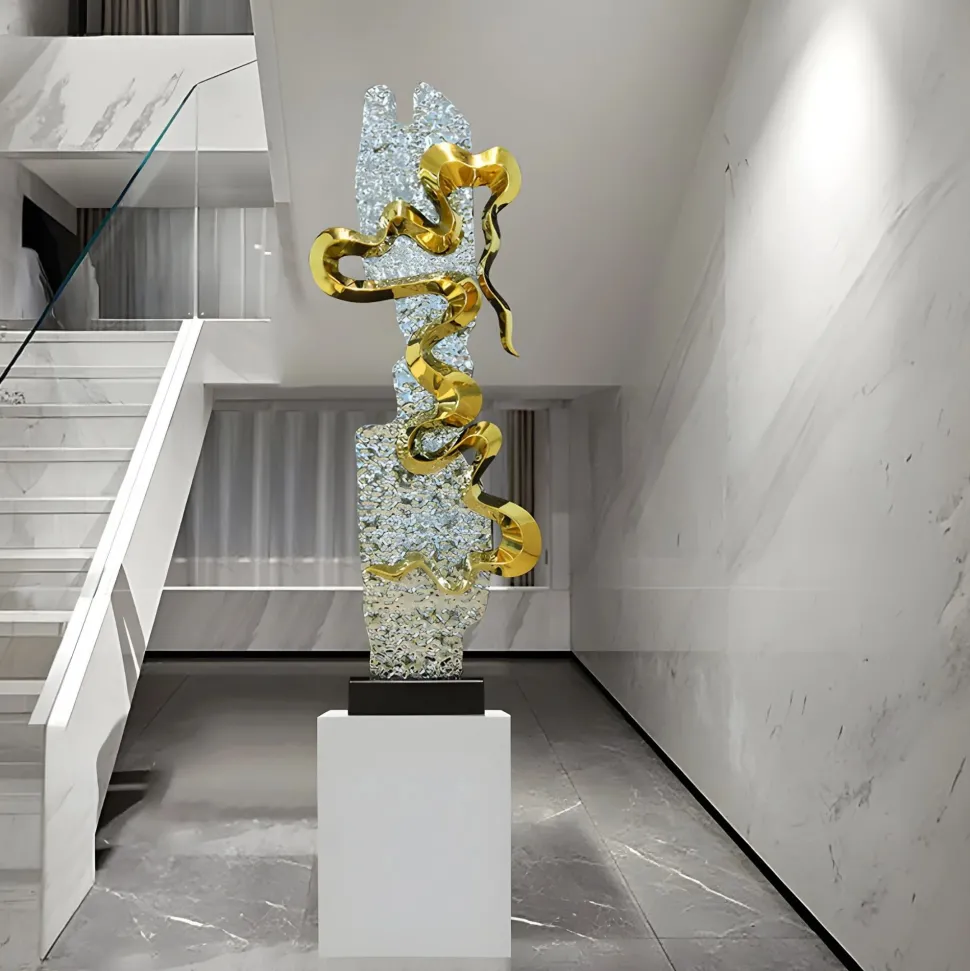 This Sonic Pulse Stainless Steel Sculpture seamlessly merges artistic expression with versatility making it a striking addition to both indoor and outdoor spaces. Its fluid design and carefully crafted form create a captivating focal point enhancing contemporary interiors, minimalist offices and open landscapes alike. The contrast between structured elements and flowing contours allows it to complement a variety of design aesthetics, from modern and industrial to natural and organic.