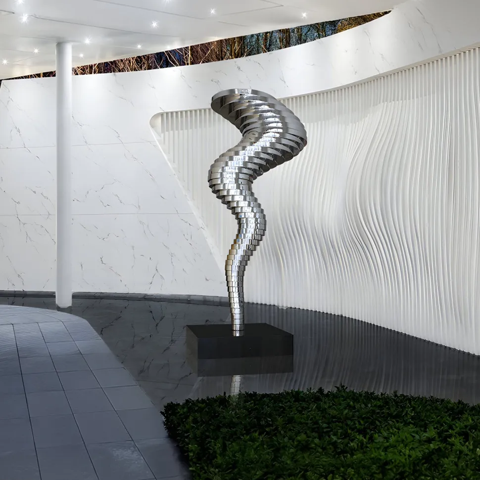 The Tornado Sculpture is a captivating expression of movement, artistry and contemporary sophistication. Crafted from high-quality stainless steel this striking piece features an intricate vortex design with swirling layered curves that create an illusion of continuous motion. The polished steel finish enhances its reflective properties dynamically interacting with light and its surroundings to produce an ever-changing visual effect. With its bold presence and flowing form, this sculpture serves as a compelling focal point that draws attention and sparks conversation.
