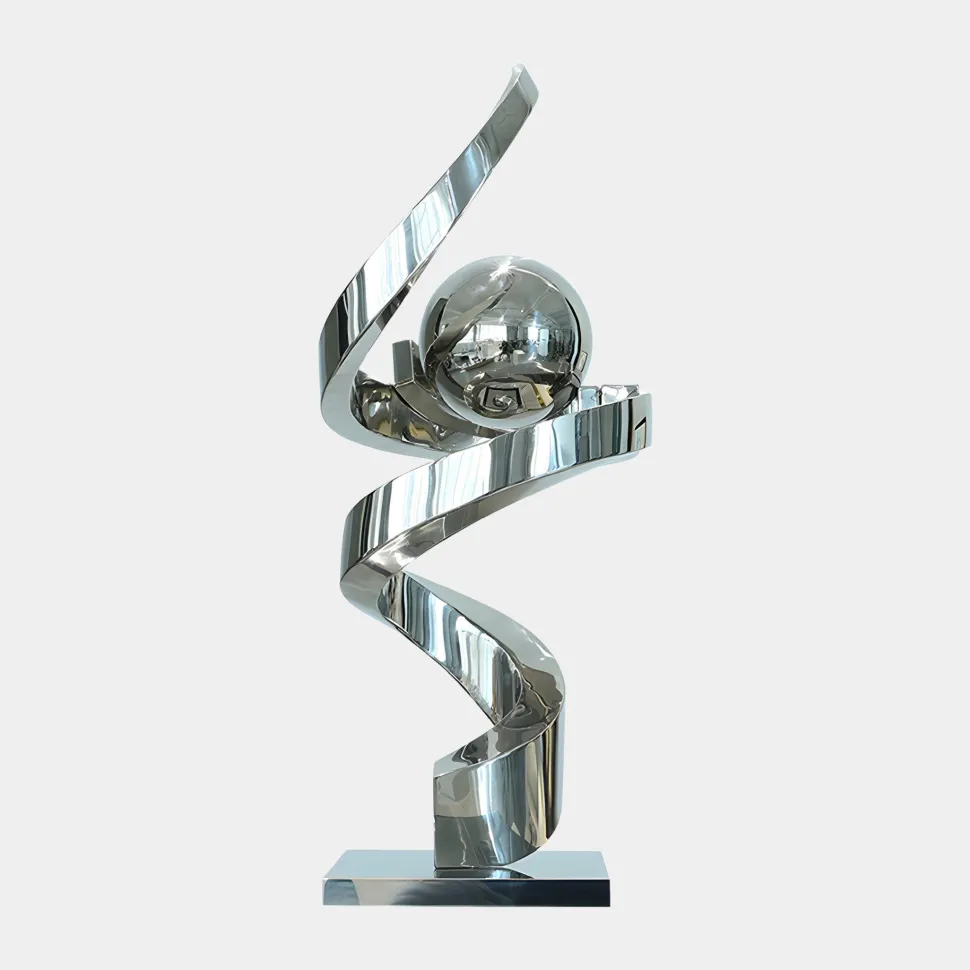 The Gravity Sphere Sculpture is a stunning fusion of fluid motion and geometric precision featuring a gracefully twisting form that encircles a perfectly balanced sphere. This interplay between the spiralling structure and the sphere represents harmony, balance and continuous movement evoking a sense of infinite flow. Expertly crafted from premium stainless steel its highly reflective surfaces interact dynamically with light, shifting in appearance depending on the angle and surroundings. Whether placed indoors or outdoors this captivating piece transforms any space into a statement of modern artistry.