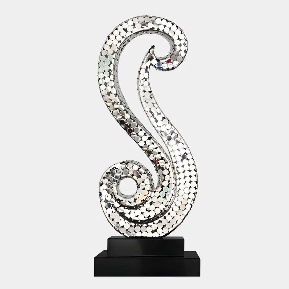 The sculpture’s reflective surfaces and fluid contours create an engaging interplay of light and movement drawing attention and sparking conversation. Its contemporary design makes it a captivating centrepiece that enhances any space with sophistication and artistic depth. Whether you are an art enthusiast or simply seeking to enrich your environment with a distinctive statement piece, the Iconic Symphony Sculpture offers a timeless blend of modern artistry and refined elegance making it an enduring and impactful addition to any setting.